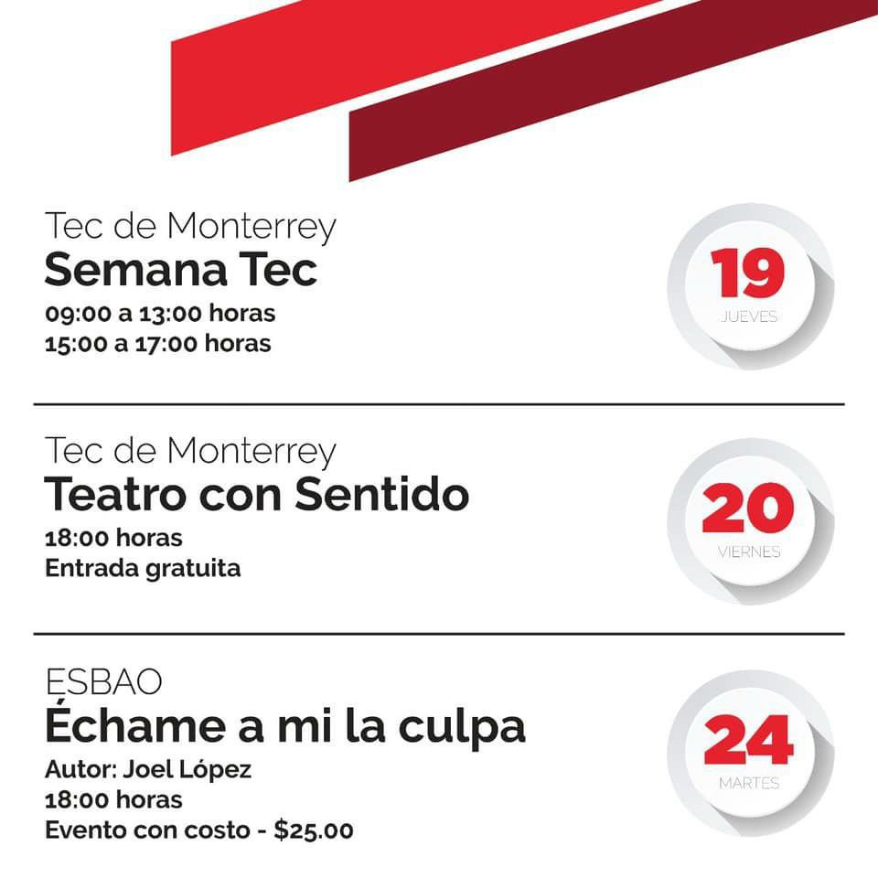 Siguiendo con el programa, el 19 el Tecnológico de Monterrey tendrá dos actividades de 9 a 13 horas y de 15 a 17 horas y el lunes 20, a las 18 horas, estará presentando “Teatro con Sentido”, presentación con acceso gratuito al público; para el 24 de marzo la ESBAO, estará montando la obra “Échame a mi la culpa” cuyo acceso será de $25.