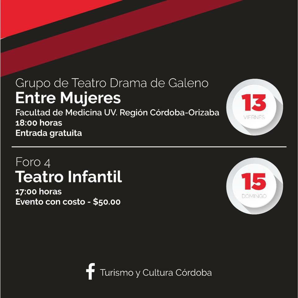 Zilly Basurto detalló que estas actividades iniciarán este viernes 13 de marzo, a las 18 horas, con la presentación de la obra “Entre mujeres”,  del Grupo de Teatro Drama de Galeno de la Facultad de Medicina de la UV, con acceso gratuito, para el domingo 15, a las 17 horas, la compañía Foro 4 presentará “Teatro Infantil”, con una cuota de recuperación de 50 pesos.