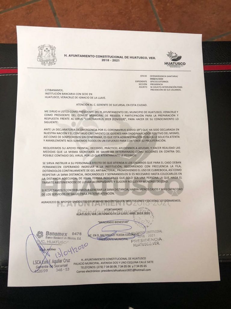 Los escritos donde se pide a comercios y bancos, se sumen a las medidas de prevención contra el coronavirus que ha implementado este gobierno municipal, fueron dirigidos a: BBVA, Citibanamex, Scotiabank, Banco Azteca, Banco del Bienestar, Caja Popular de Ahorros Yanga, Centro Integrador de Bienestar, Tiendas Chedraui, Bodega Aurrera, Financiera Mexicana para el Desarrollo Rural, Cadena Comercial Oxxo , Coppel S.A. de C.V. , Grupo Elektra, Comercial Claudia y Abastemex.