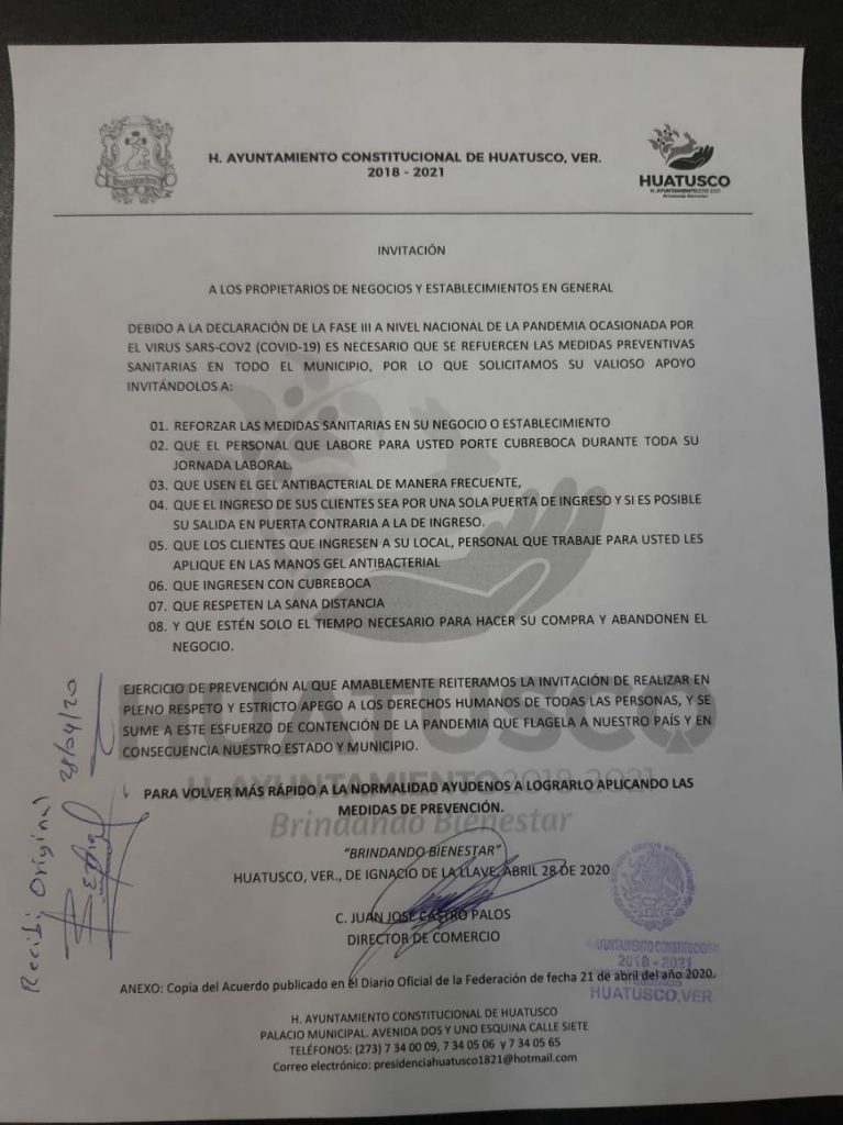 A través de un oficio girado por la Dirección de Comercio, el H. Ayuntamiento de Huatusco, pide a los propietarios de negocios y establecimientos en general, refuercen las medidas de prevención ante la pandemia del coronavirus.