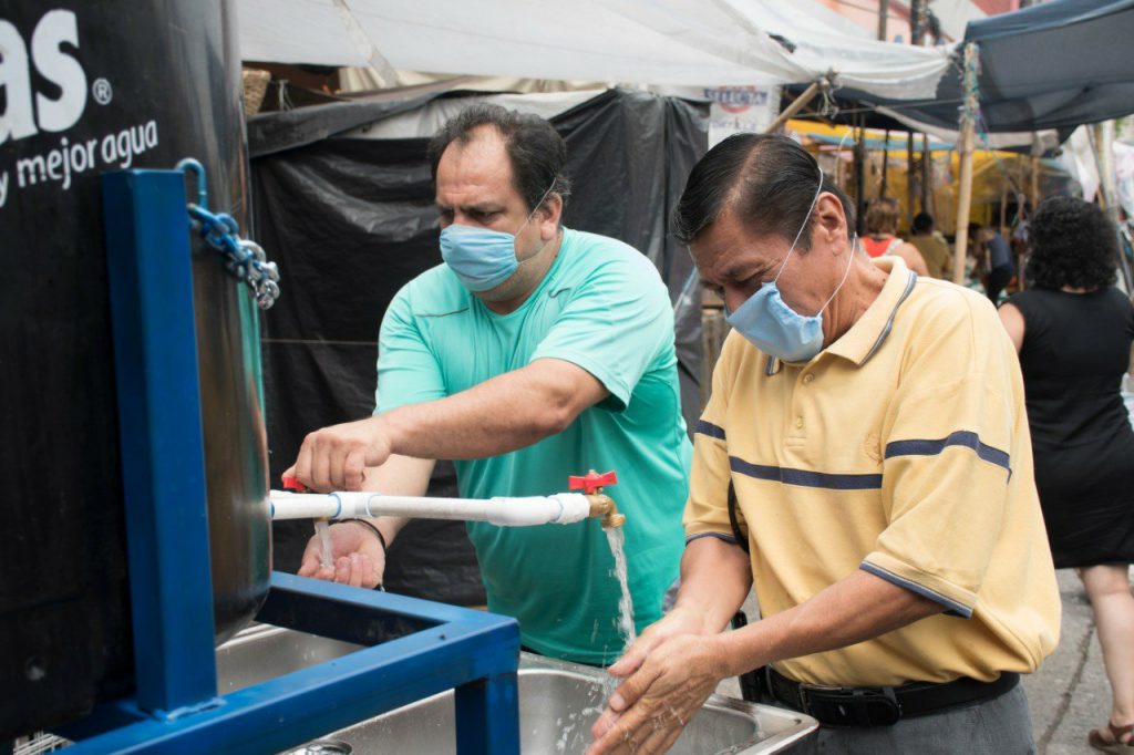 En este marco, José Sierra, titular de la UMPC Córdoba y Maximino García Guzmán, director de comercio, anunciaron que el Ayuntamiento de Córdoba inició la entrega de cubreboca a personas que tengan necesidad de realizar compras en la zona comercial de este municipio, así como la instalación de módulos lavamanos en el perímetro del mercado Revolución.