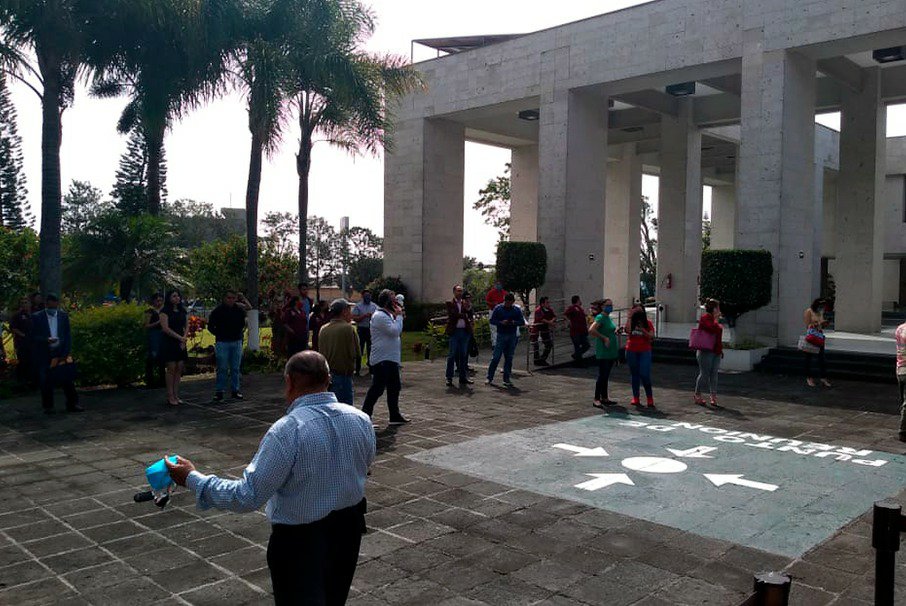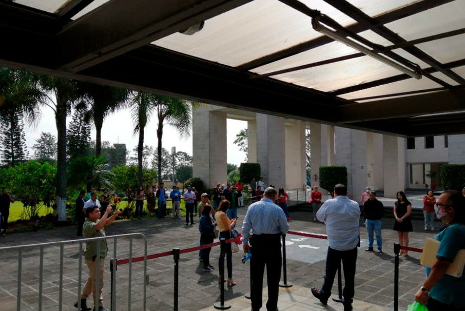 El diputado Jorge Moreno Salinas se mantuvo atento a las acciones, al lado del jefe de Seguridad del Congreso, Simón Díaz Íñiguez. El personal respondió a las activaciones de las alarmas sísmicas y fue conducido a los puntos de reunión marcados por la Unidad Interna de PC.