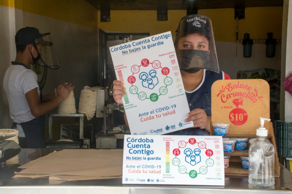 Para promover los protocolos de seguridad sanitaria y contribuir a la mitigación de contagios por COVID19, el Ayuntamiento de Córdoba puso en marcha el operativo Córdoba Cuenta Contigo mediante el cual se entrega material gráfico y caretas protectoras a fin de procurar la salud de quienes laboran y acuden a los establecimientos.