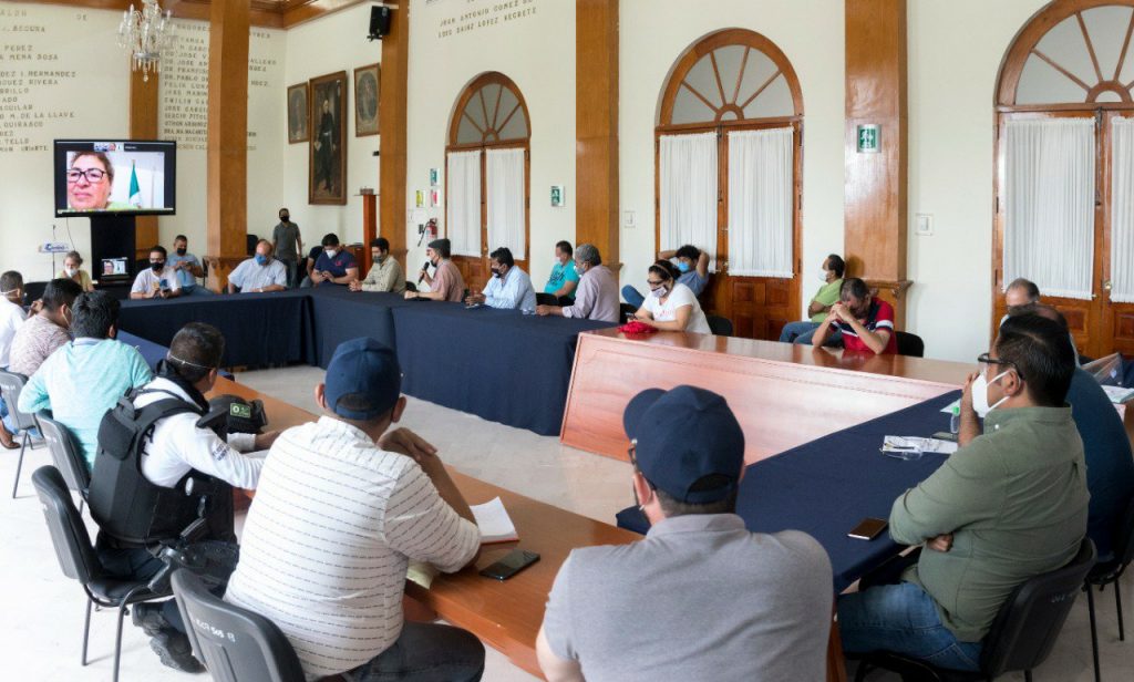 En mesa de trabajo se acordó mantener el cerco sanitario con nueve puntos de entrada y salida que estarán a cargo de las y los locatarios con apoyo de autoridades municipales, en los que se vigilará el uso obligatorio de cubreboca y la distribución de gel antibacterial.