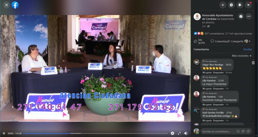 Adelantó que Miércoles Contigo se transmitirá semanalmente a través de la página de Facebook del H. Ayuntamiento de Córdoba y contará con su participación y la de Directores de área, para escuchar, atender y resolver peticiones ciudadanas expresadas a través de las líneas telefónicas y mensajes directos.