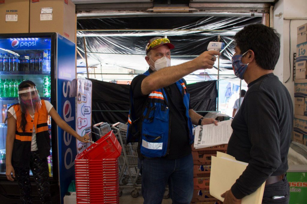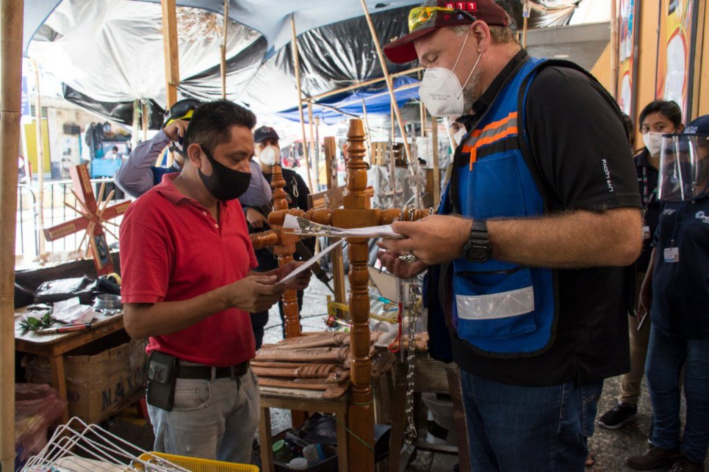 José Sierra Silva, coordinador de la Unidad Municipal de Protección Civil (UMPC), en coordinación con personal de la Jefatura de Salud y de la Dirección de Comercio y de la Policía Municipal, recorrió el mercado Revolución y sus alrededores para notificar por escrito a locatarios y comerciantes sobre la importancia del uso del cubreboca para evitar la propagación del SARS- COV-2.