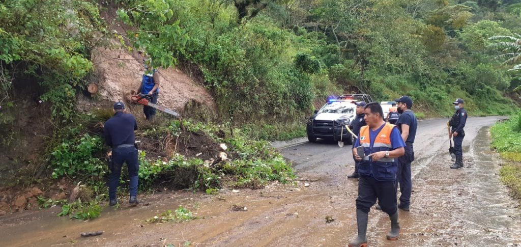 Personal de PC se encuentra abanderando el área para evitar que se produzcan accidentes; exhortan también a los conductores a conducir con precaución en toda esta vía y en todas las que rodean al municipio, ya que el acumulamiento de agua de lluvia a causa de las fuertes precipitaciones de anoche han ocasionado reblandecimiento de tierra en las laderas de los caminos.