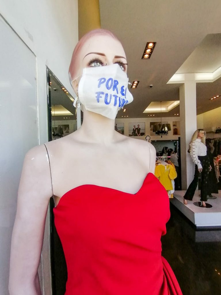 A manera de destacar la campaña se colocaron cubreboca a maniquíes de tiendas departamentales con mensajes alusivos a la protección de los entornos familiar y laboral a partir de portar de manera correcta este aditamento.