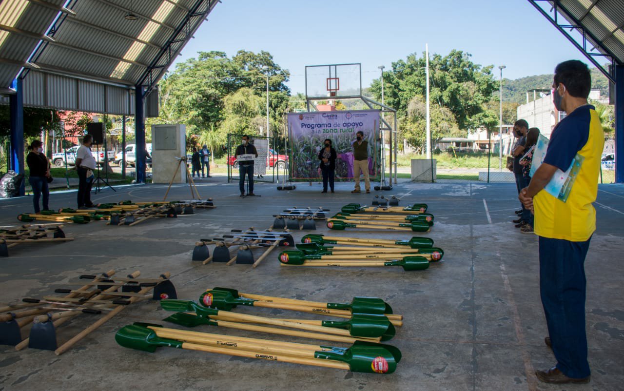 Precisó que fueron entregados azadones, cavahoyos, limas y machetes, entre otros implementos, mismos que quedan a resguardo del Agente o Subagente municipal, para estar a disposición de las y los productores de cada comunidad.