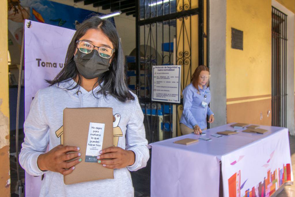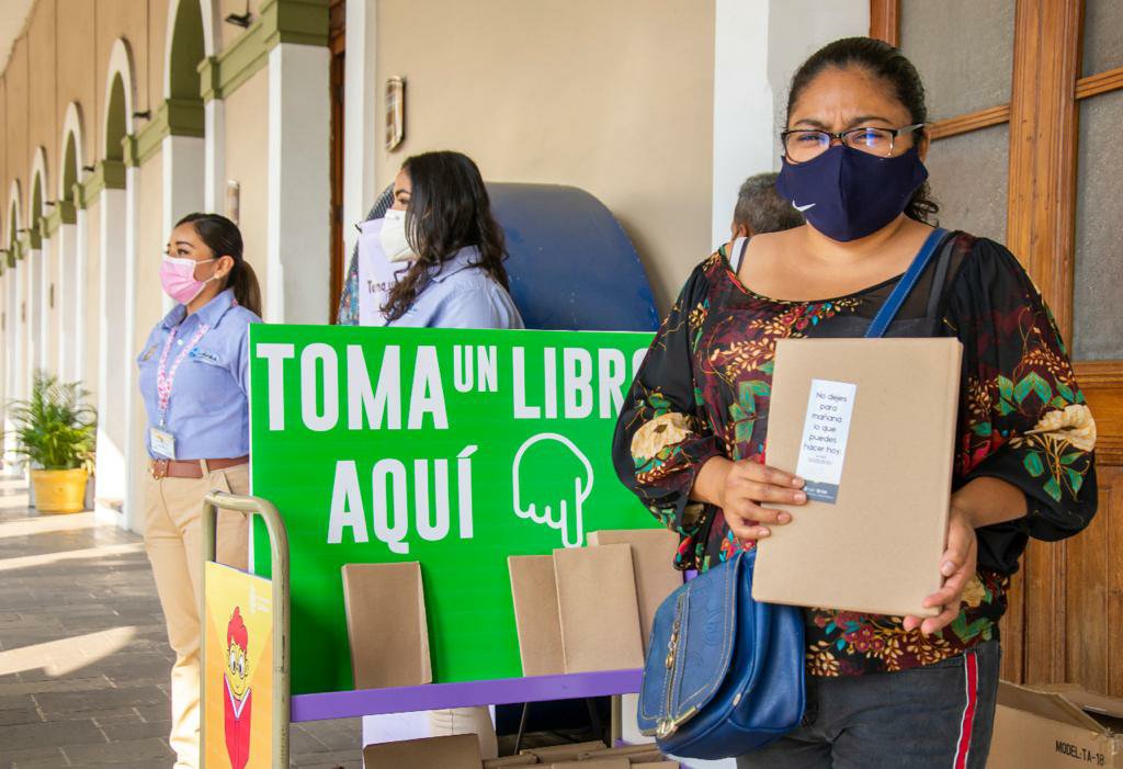 La Dirección de Educación y Cultura instaló un módulo en la biblioteca Luis Sainz López Negrete y otro más en los pasillos del Palacio Municipal, donde cada persona tomó un ejemplar forrado y lo llevó consigo para integrarlo a su biblioteca.