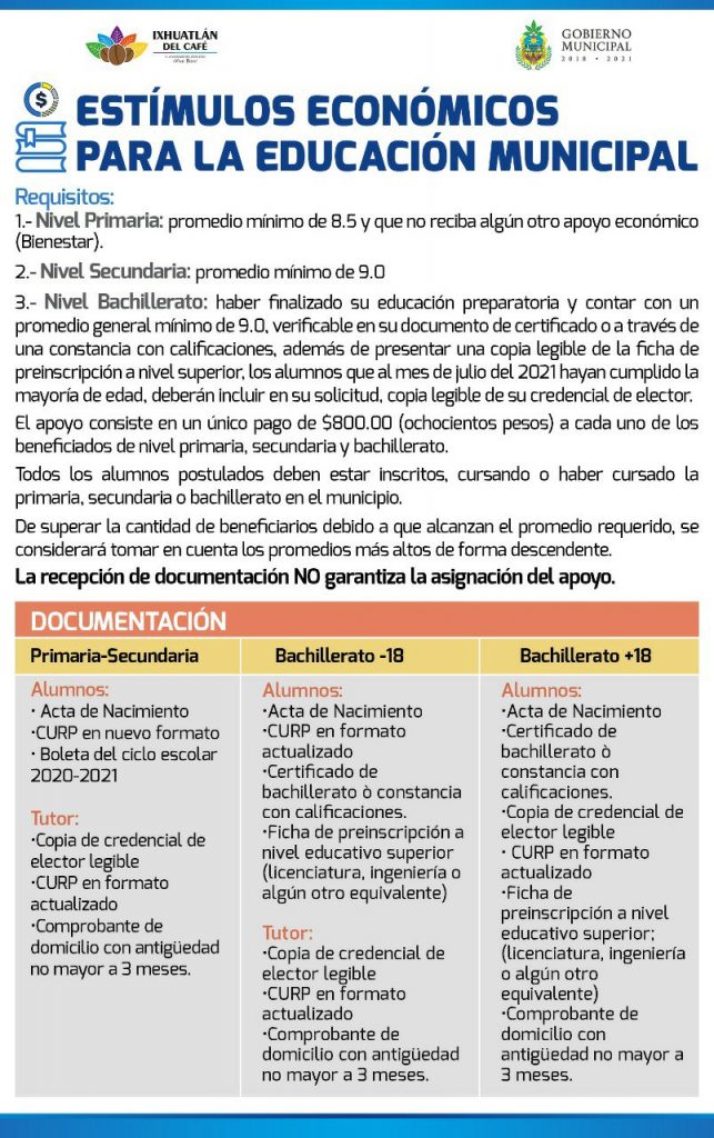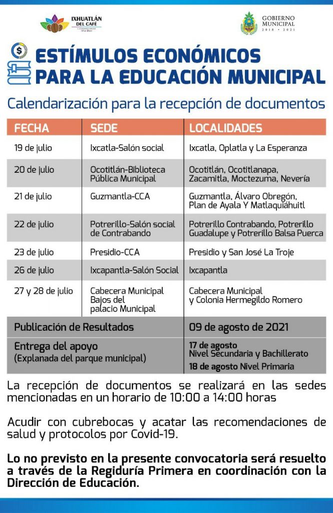Ixhuatlán Del Café.- Será del 19 a 28 de julio cuando personal del área de Educación, reciba documentos de alumnos de nivel básico y medio superior interesados en formar parte del grupo de beneficiados del programa Estímulos Económicos para la Educación municipal.