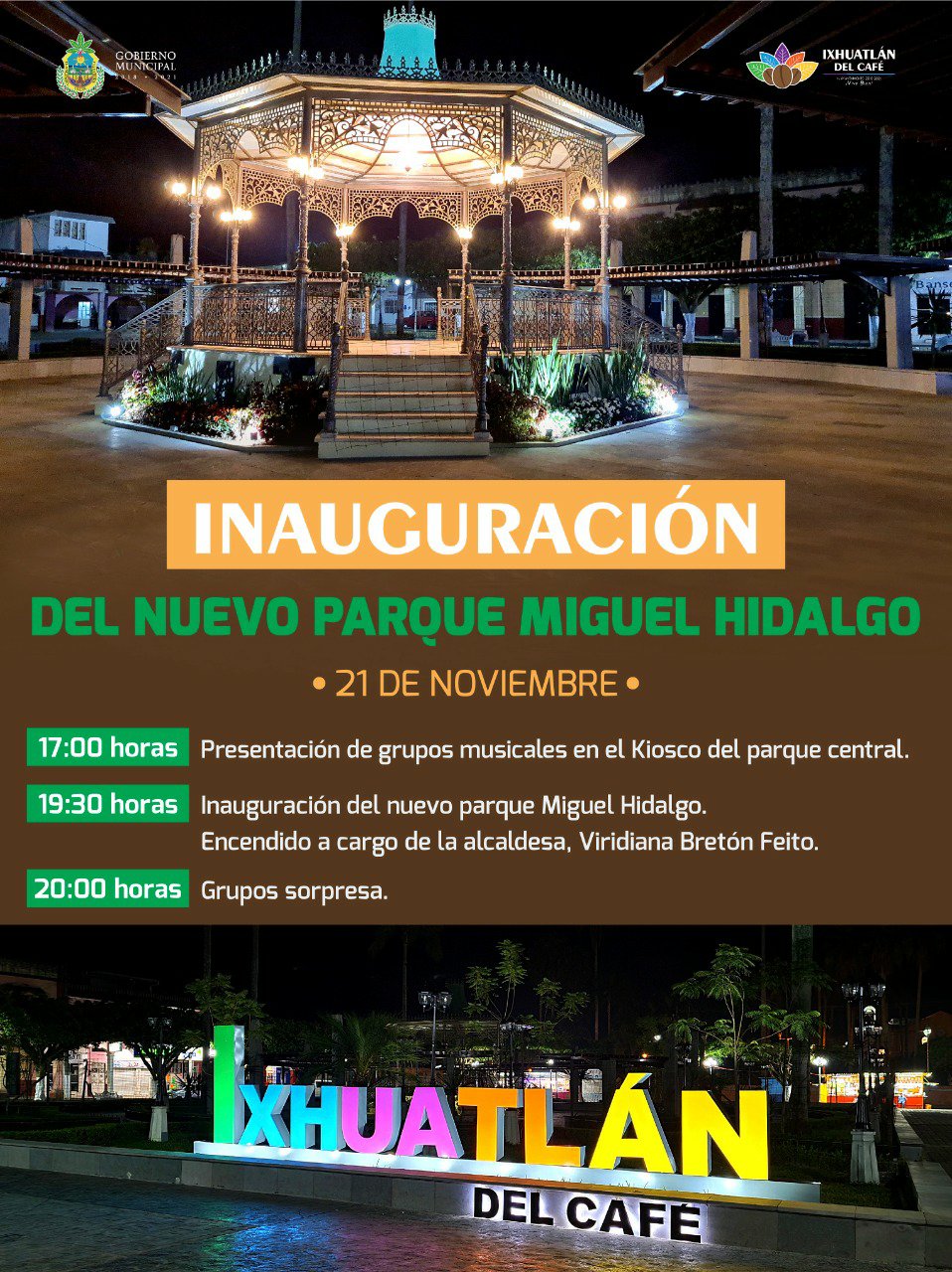 Ixhuatlán Del Café.- Las remodelaciones del parque infantil y del parque Miguel Hidalgo, serán inauguradas el próximo 21 de noviembre por parte de autoridades municipales y ciudadanía en general.