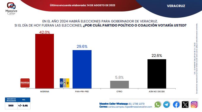 En el sondeo más reciente de la casa encuestadora Massive Caller, el partido Morena mantiene una ventaja de 13 puntos sobre la alianza PAN-PRI-PRD, al posicionarse con una intención de voto de 42 por ciento contra 29.6 por ciento de la oposición, mientras que a Rocío Nahle 42 por ciento de los encuestados la respaldan.