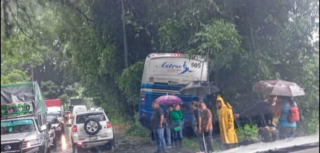 En una curva cercana a la comunidad de La Raya, un autobús de la línea Astro New se vio obligado a salirse de la carretera para evitar una colisión frontal, luego de que un tráiler invadiera su carril.